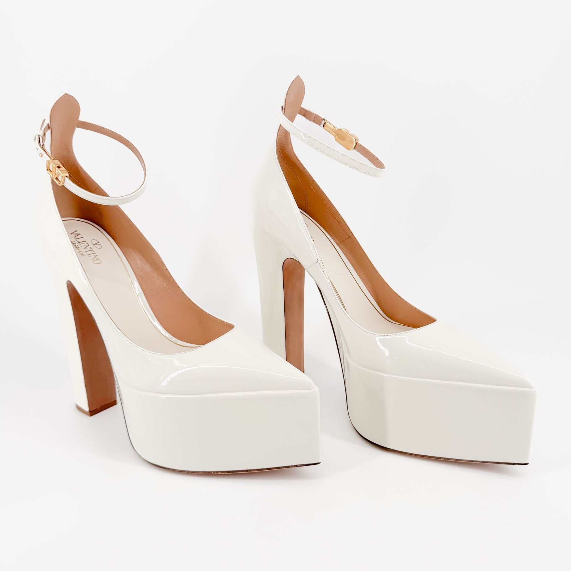 Step into glamour with these Valentino pumps in glossy white patent leather. Featuring a pointed toe and a chunky platform, these block heel pumps are elevated by an ankle strap adorned with the iconic gold-tone Vlogo. A leather footbed and lining ensure lasting comfort, while the leather outsole adds sophistication. Perfect for weddings, evening events, or when you want a statement-making finish to your look.