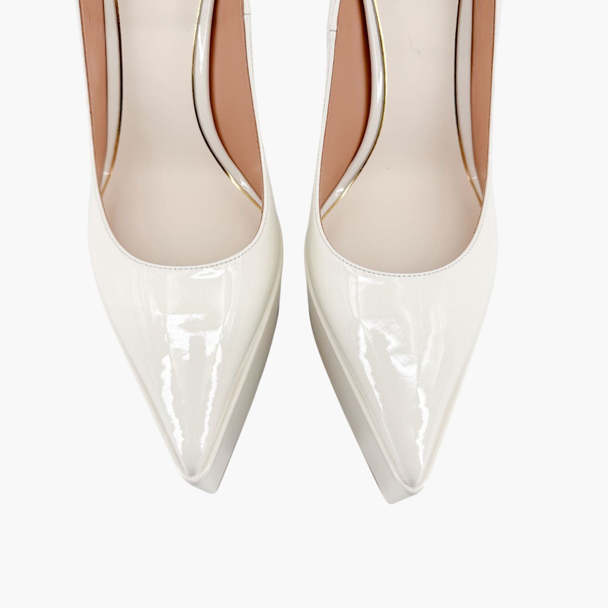 - Glossy white patent leather upper