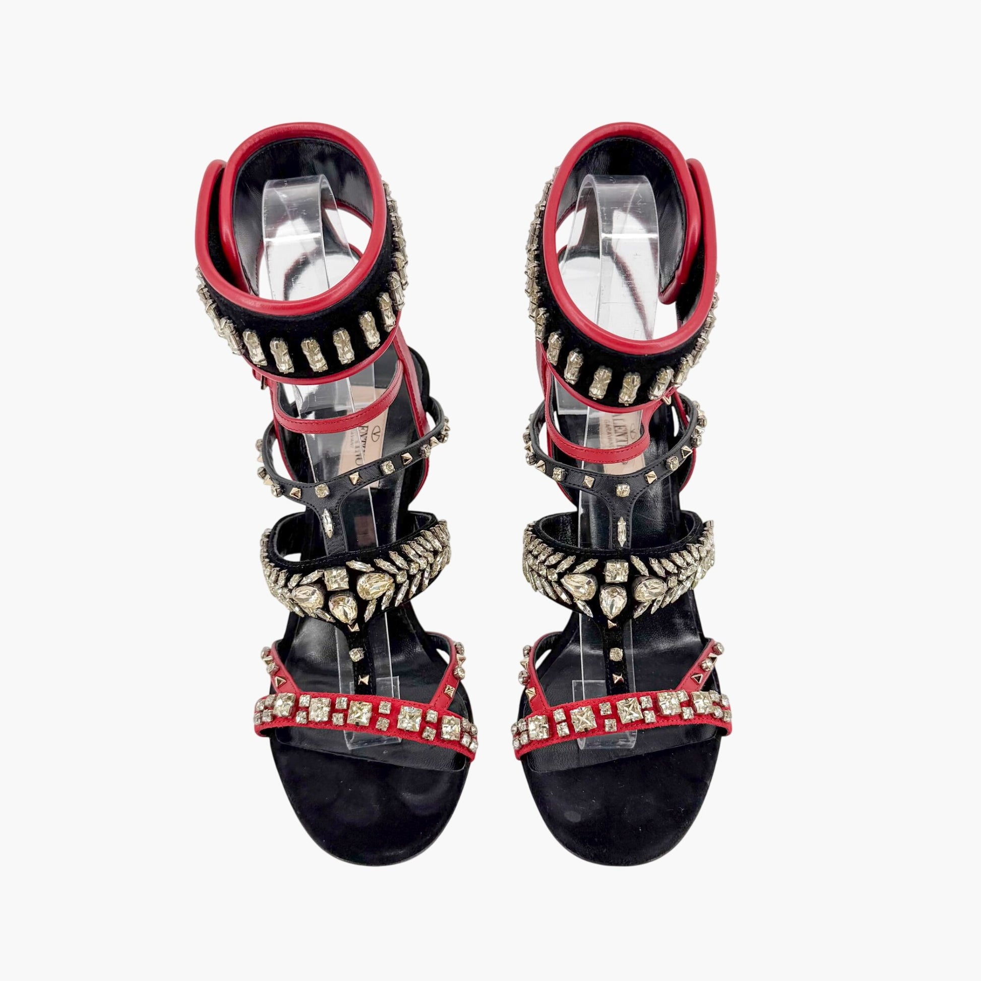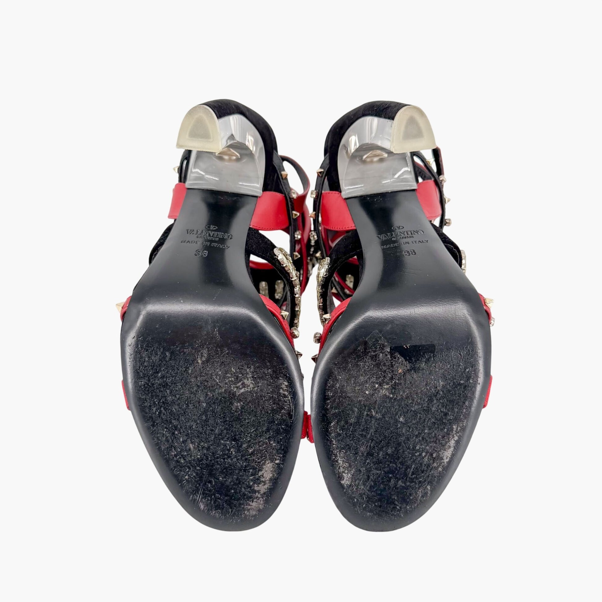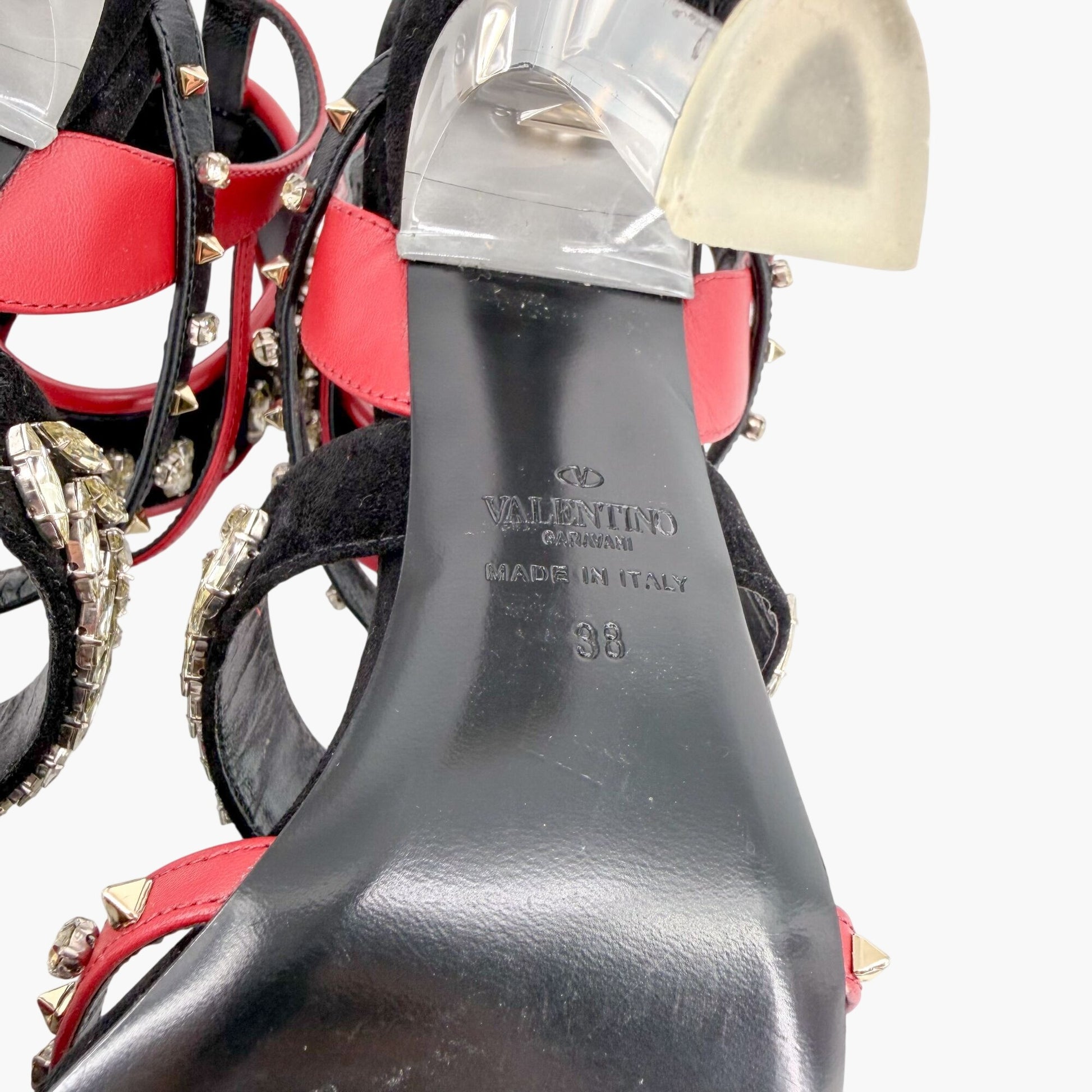 These Valentino Garavani Rockstud Crystal Leaves caged sandals feature black and red leather and suede straps embellished with multiple crystal shapes and signature gold-tone Rockstud accents. The strappy T-strap silhouette includes a transparent lucite block heel and open round toe, creating a bold statement heel that works well for evening wear, events, or bridal-adjacent styling.